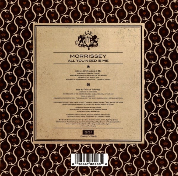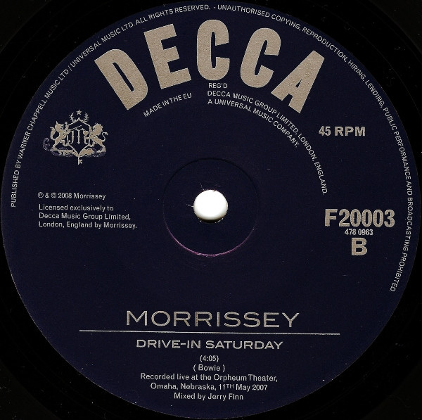 'Drive-In Saturday' appears on the B-side of one of the two 7-inch vinyl versions of Morrissey's 37th single, 'All You Need Is Me'. Released June 2, 2008 in the UK for only one week, each format of the single has a different B-side: