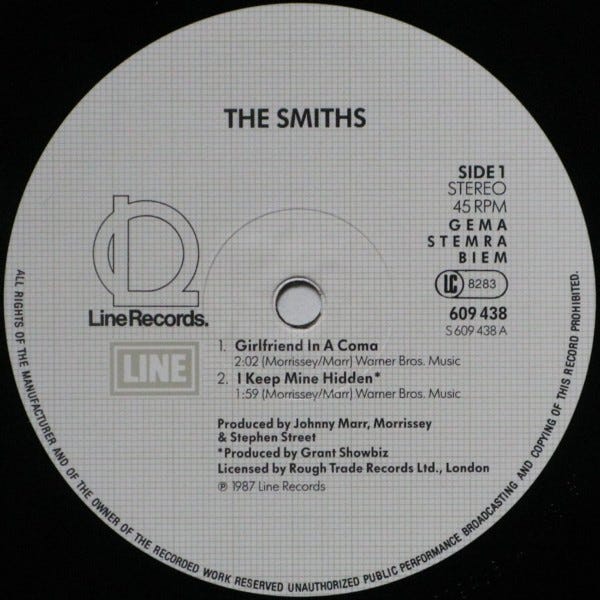 "It was utter misery. The group were really falling to pieces. We'd finished making the record and I thought, 'Right, now for the first time, I can have a couple of weeks way from the group'. That's all it was. I wanted to get away and I felt we should all have taken a holiday. I told Morrissey he needed a holiday. The band put what I thought was really unfair pressure to come up with two B-sides for 'Girlfriend In A Coma'. I fought against it. I felt I'd worked far too hard to be put in that position, coupled with the fact that Morrissey had decided he didn't want to work with Ken [Ken Friedman, the manager of the Smiths at the time]. That was OK. That was a problem I could have dealt with. I just felt round the corner it was never ending. It was like I was never going to be allowed to come up for air [...] I wrote 'I Keep Mine Hidden', but 'Work Is A Four Letter Word' I hated. That was the last straw, really. I didn't form a group to perform Cilla Black songs. That's the main thing."6