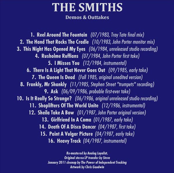 It is not known why the Smiths’ did not deem the song to be worthy of further time and attention given its gentle and melodious sound, which Morrissey would have undoubtedly done justice to lyrically. Presumably a surfeit of material gave them pause, never to return to the unfinished track.