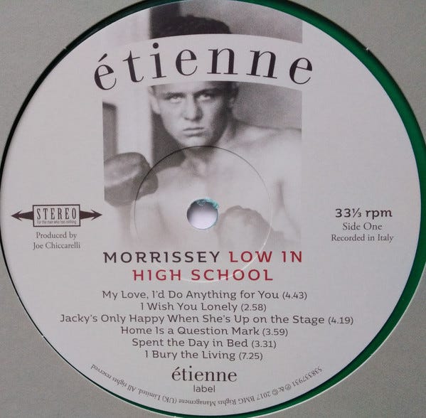 Co-written with guitarist Boz Boorer, “I Wish You Lonely” is the second track on Low in High School, Morrissey’s eleventh studio album (released November 17, 2017). Recording commenced in June 2017 at Forum Music Village in Rome and concluded in August at La Fabrique in St-Rémy, France. Produced by Joe Chiccarelli1, the musicians on the song are Boz Boorer and Jesse Tobias on guitar, Mando Lopez2 on bass, Matthew “Matt” Walker on drums, and Gustavo Manzur on keyboards.