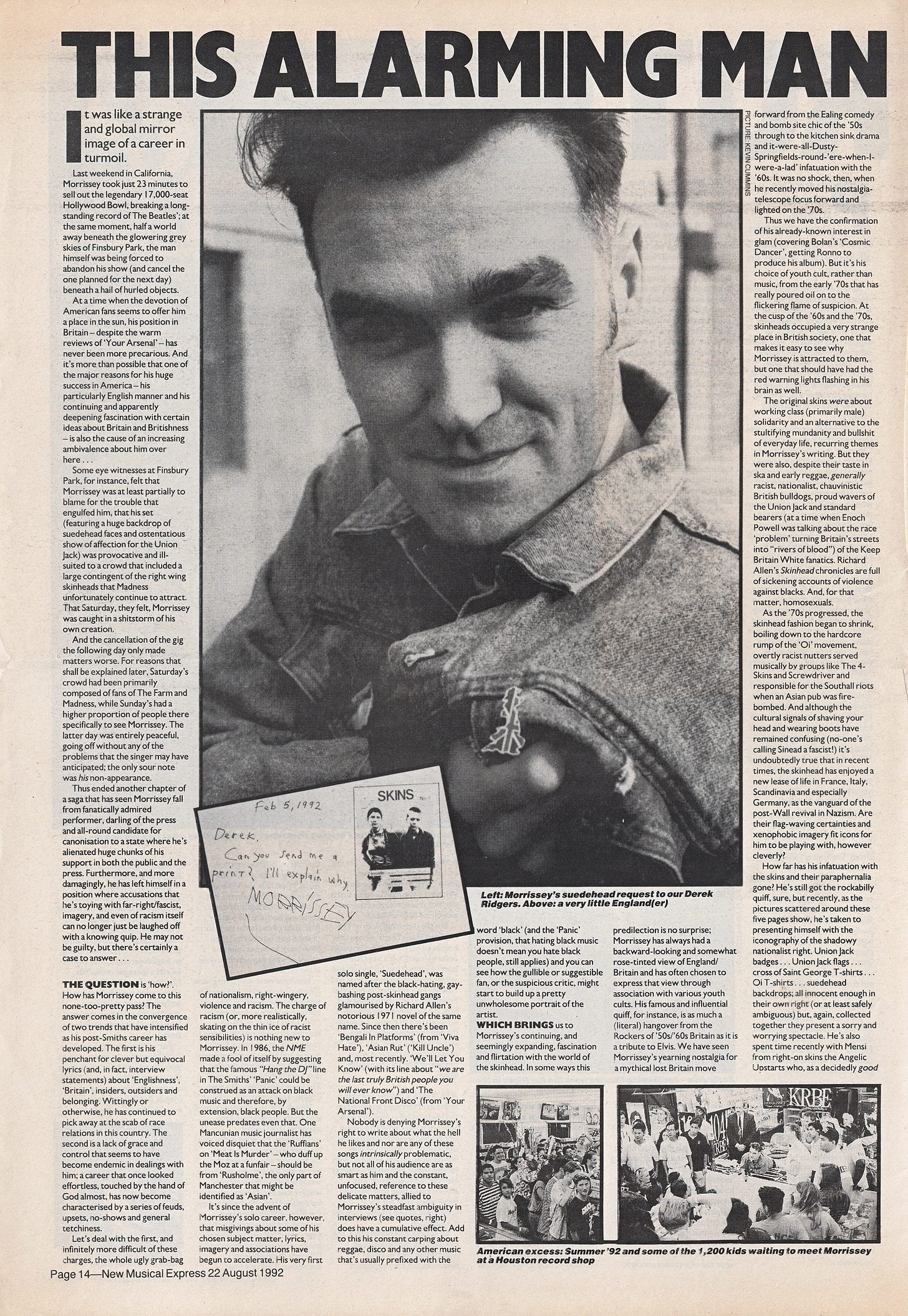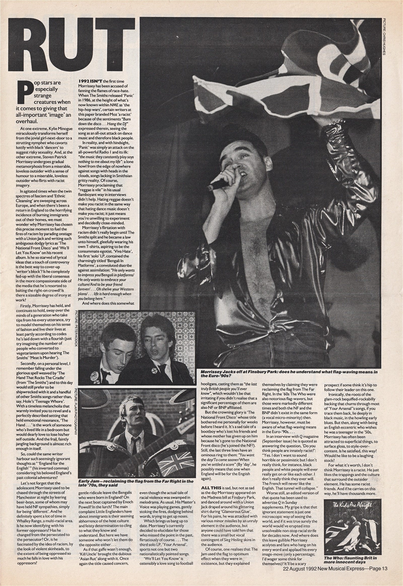 Apparently, the NME found a fine line between patriotism and racism, as their article on Morrissey cited song lyrics and quotes from interviews, to show that he had long been “toying with far-Right/fascist imagery, and even of racism itself”, with his display of the dreaded Union Jack as the proverbial last straw. While the NME stopped short of calling Morrissey a racist, it concluded that “he has continued to pick away at the scab of race relations”.