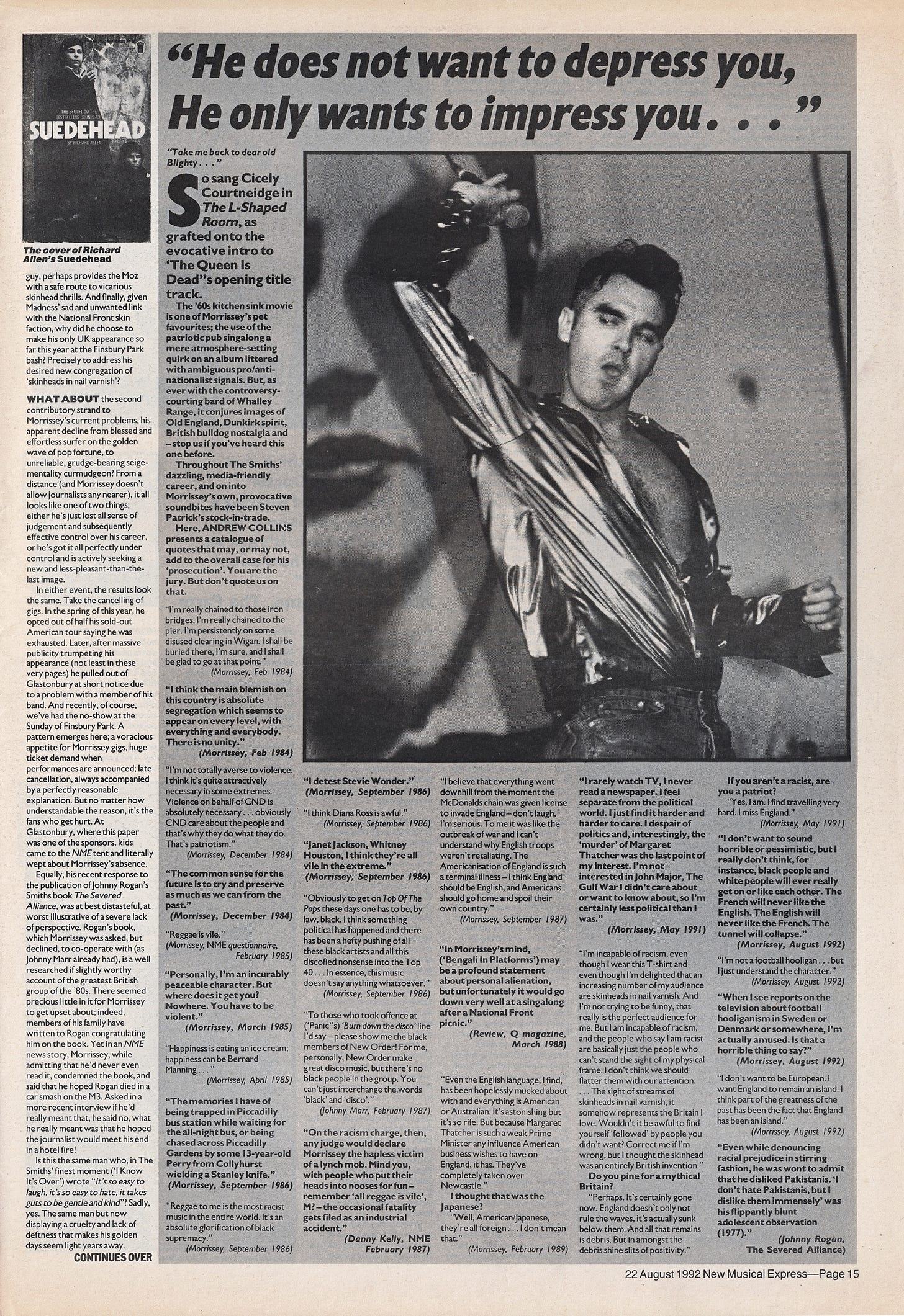 As the saying goes, timing and perception are everything; it did not help that Morrissey was quoted in Q Magazine barely a month after the festival as saying that he didn't "really think, for instance, black people and white people will ever really get on or like each other. I don't really think they ever will." This comment - really an inconclusive observation - upset the sensibilities of some, and served to exacerbate the issue.