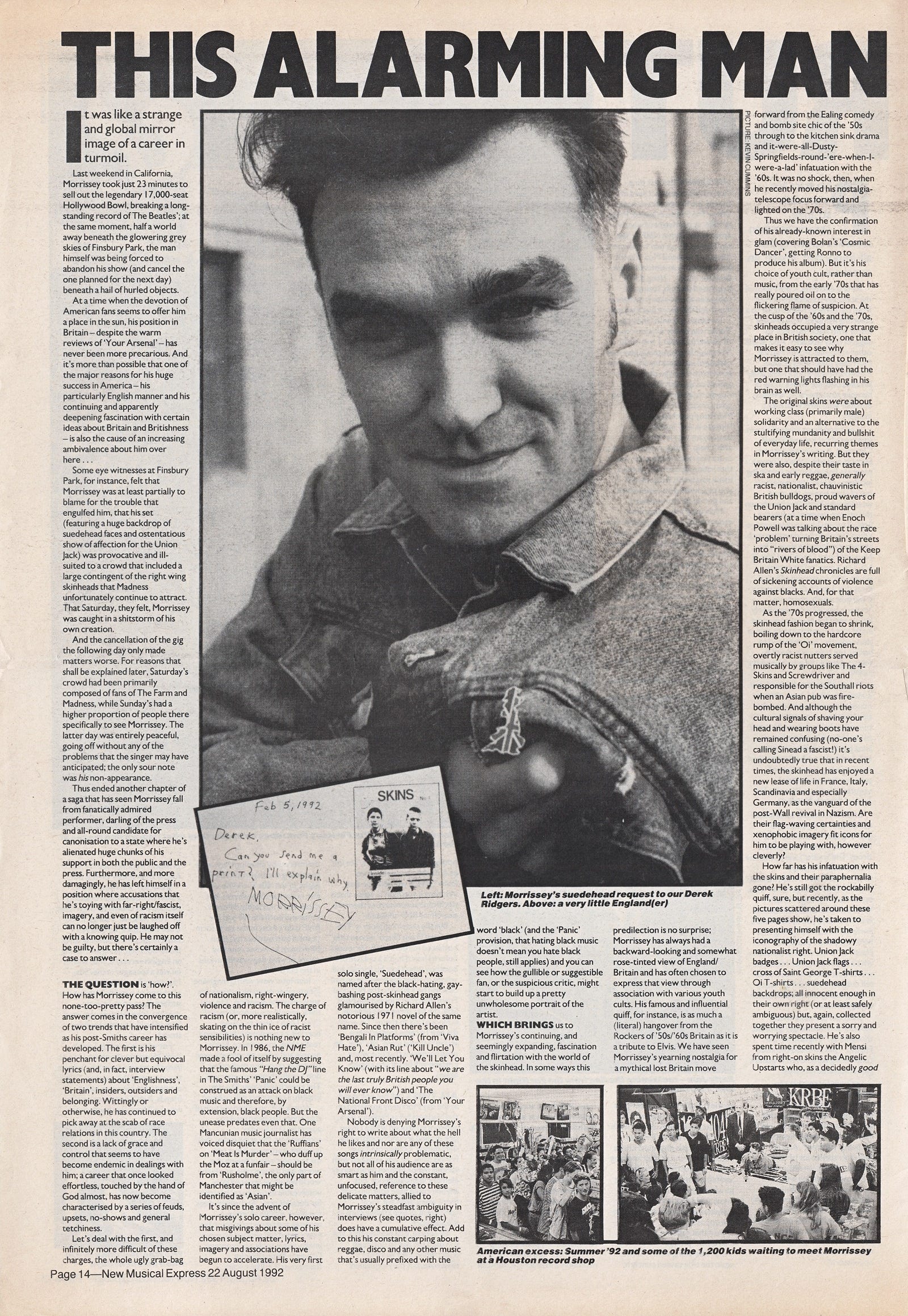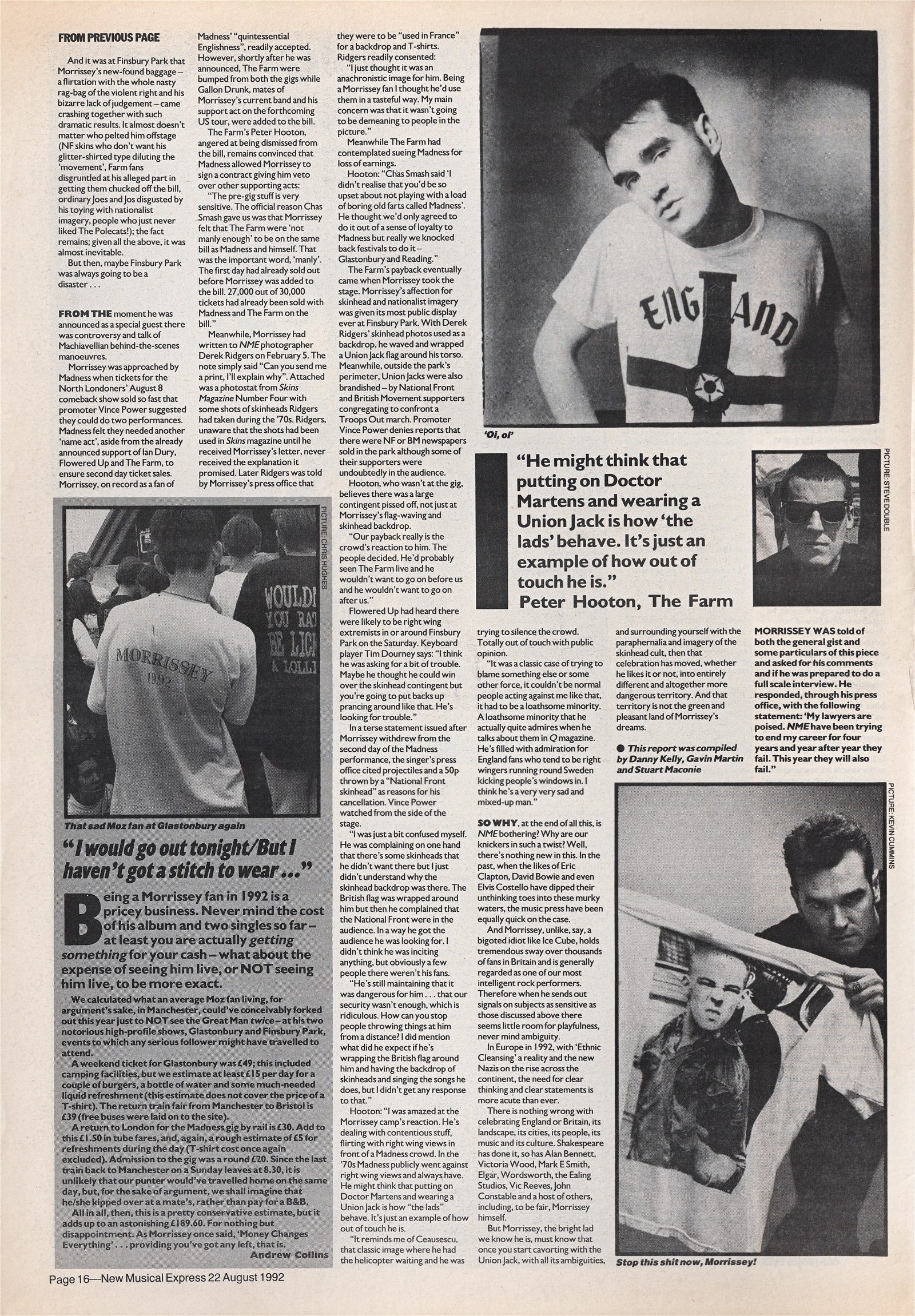 The juxtaposition of the Union Jack and backdrop of two skinhead girls provoked the NME into devoting its front cover and a staggering 6,000 words to the question of whether Morrissey had gone too far at Finsbury. Given that by 1992 the Union Jack was seen as deeply suspect in Leftish culture for some time (a perception that continues to this day), Morrissey’s display of the flag, even if it was meant merely as a sort of prop, conjured up images of the former British Empire, which is generally regarded as something quite bad in progressive circles. Indeed, by the 1990’s the Union Jack was perceived by some in the UK to be closely associated with domestic extreme-right groups.