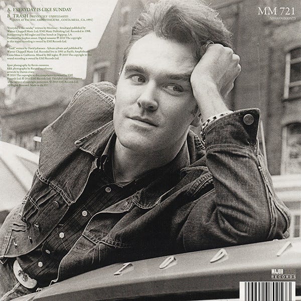 Morrissey’s live cover of the New York Dolls’ ‘Trash’ was released October 5, 2010 as the B-side on the reissued ‘Everyday Is Like Sunday’ single (his 40th single). The track was recorded on June 1, 1991 at the Pacific Amphitheater in Costa Mesa, California on the first North America leg of the Kill Uncle tour. Morrissey performed the song a total of 38 times in concert, all limited to the 1991 Kill Uncle tour.
